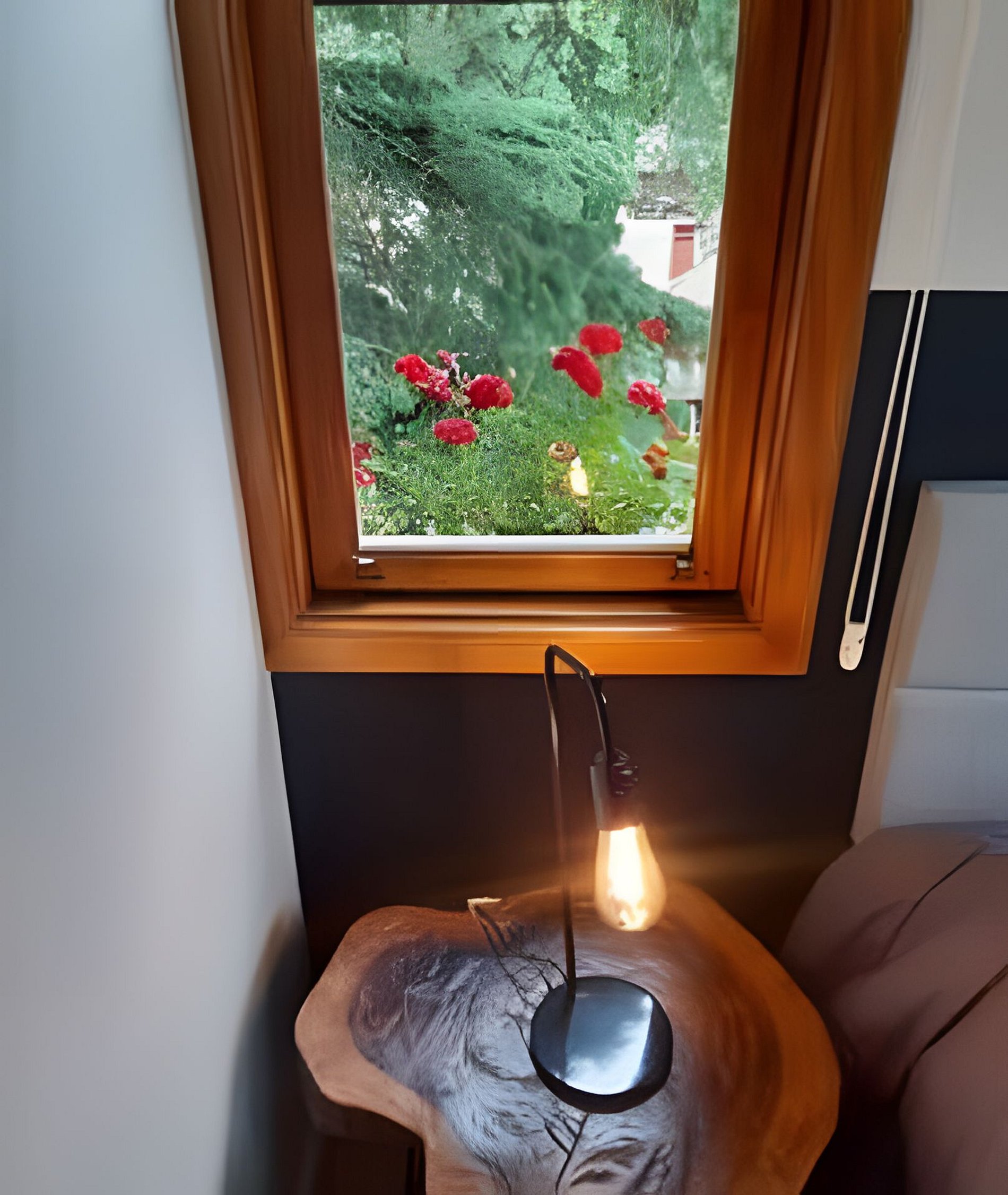 Sockets next to the bed and dining table.