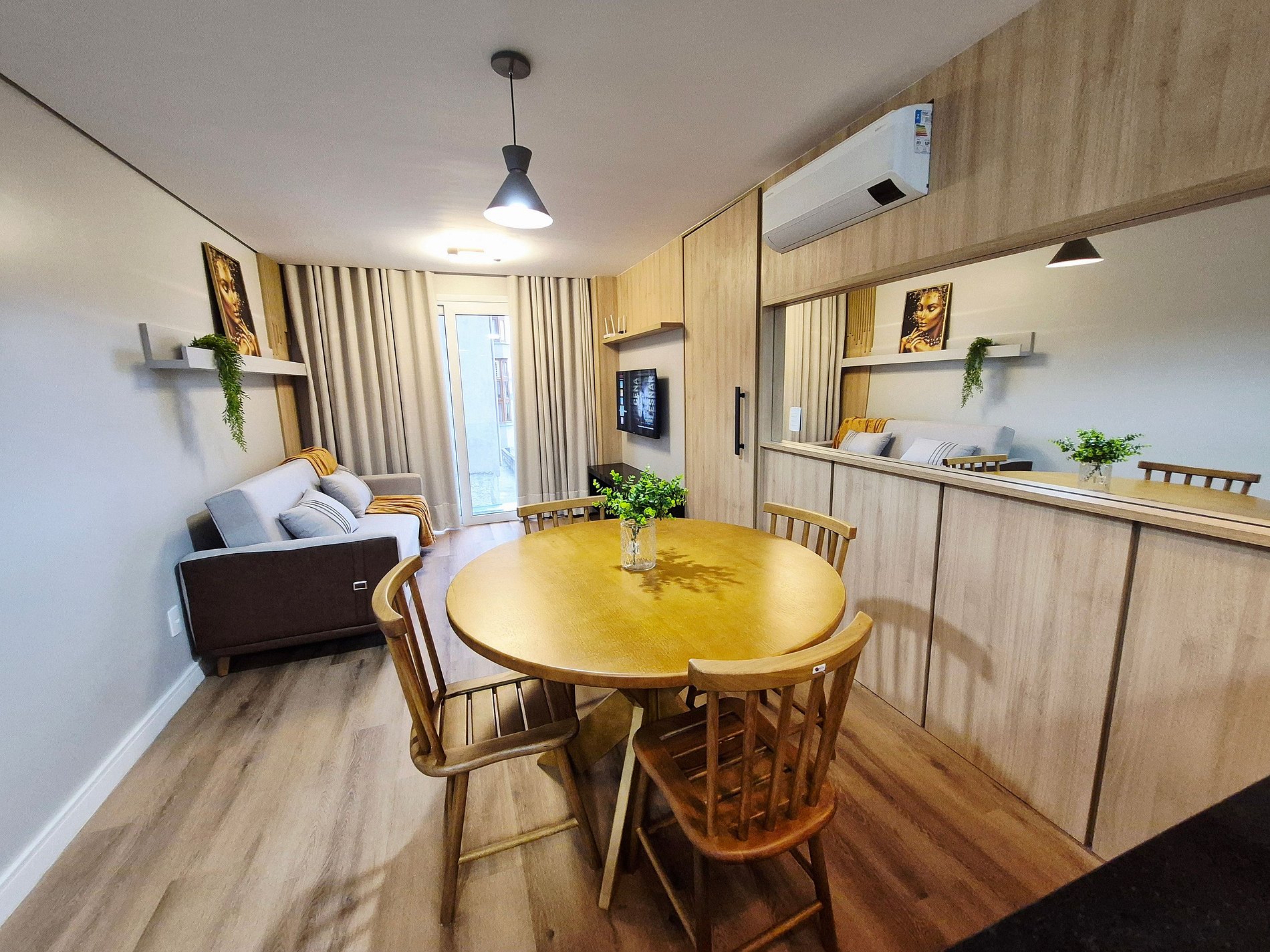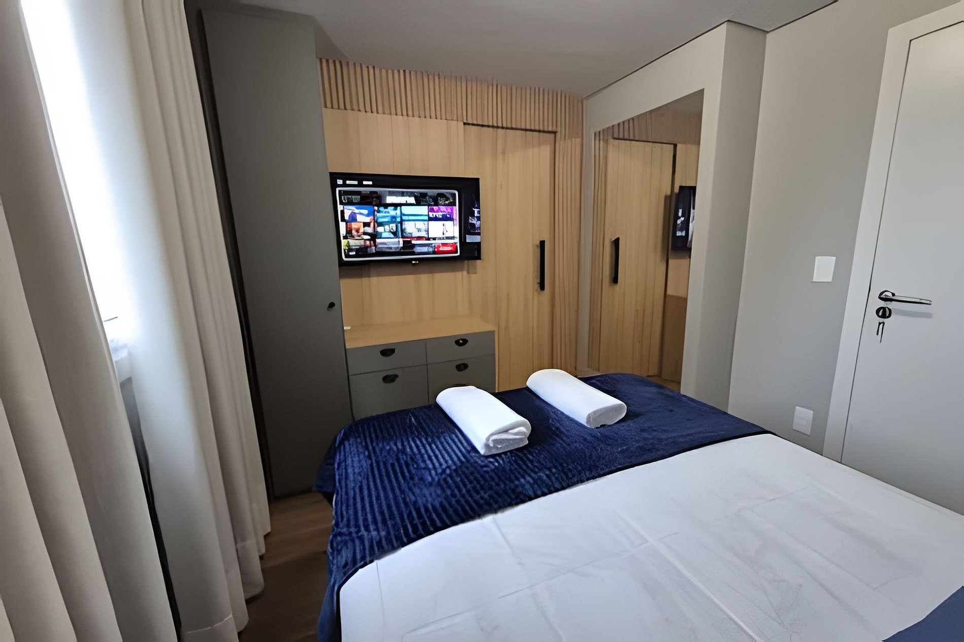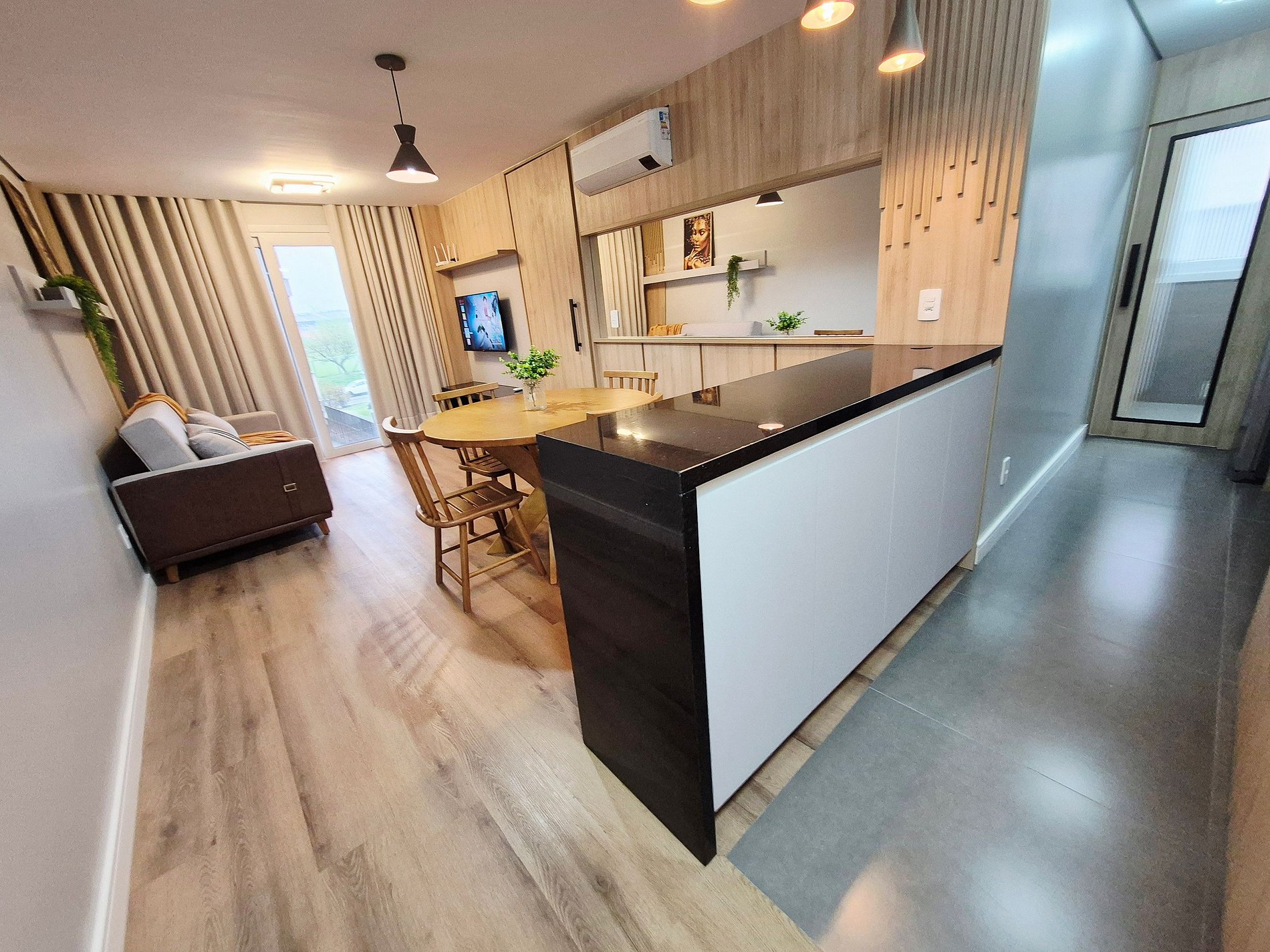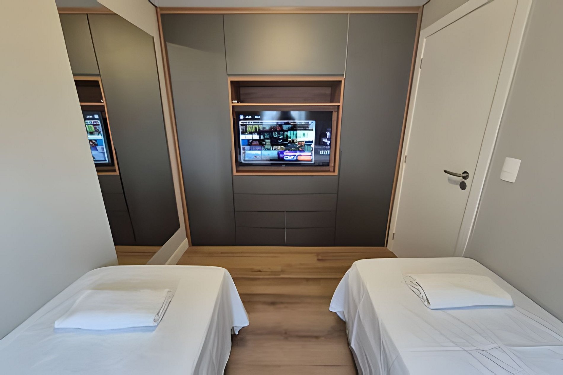 Apartamento de 2 habitaciones, moderno y acogedor, ideal para familias o parejas. Cuenta con una suite con cama matrimonial. El segundo dormitorio es versátil, con 2 camas individuales (que se pueden unir para formar una cama doble). Colchón extra para niño disponible bajo solicitud previa. Aire acondicionado frío/calor en todos los ambientes. Cafetería y supermercado cercanos, además de parques como Selfie Gramado y NBA. Muebles y utensilios de alta calidad garantizan confort y practicidad.