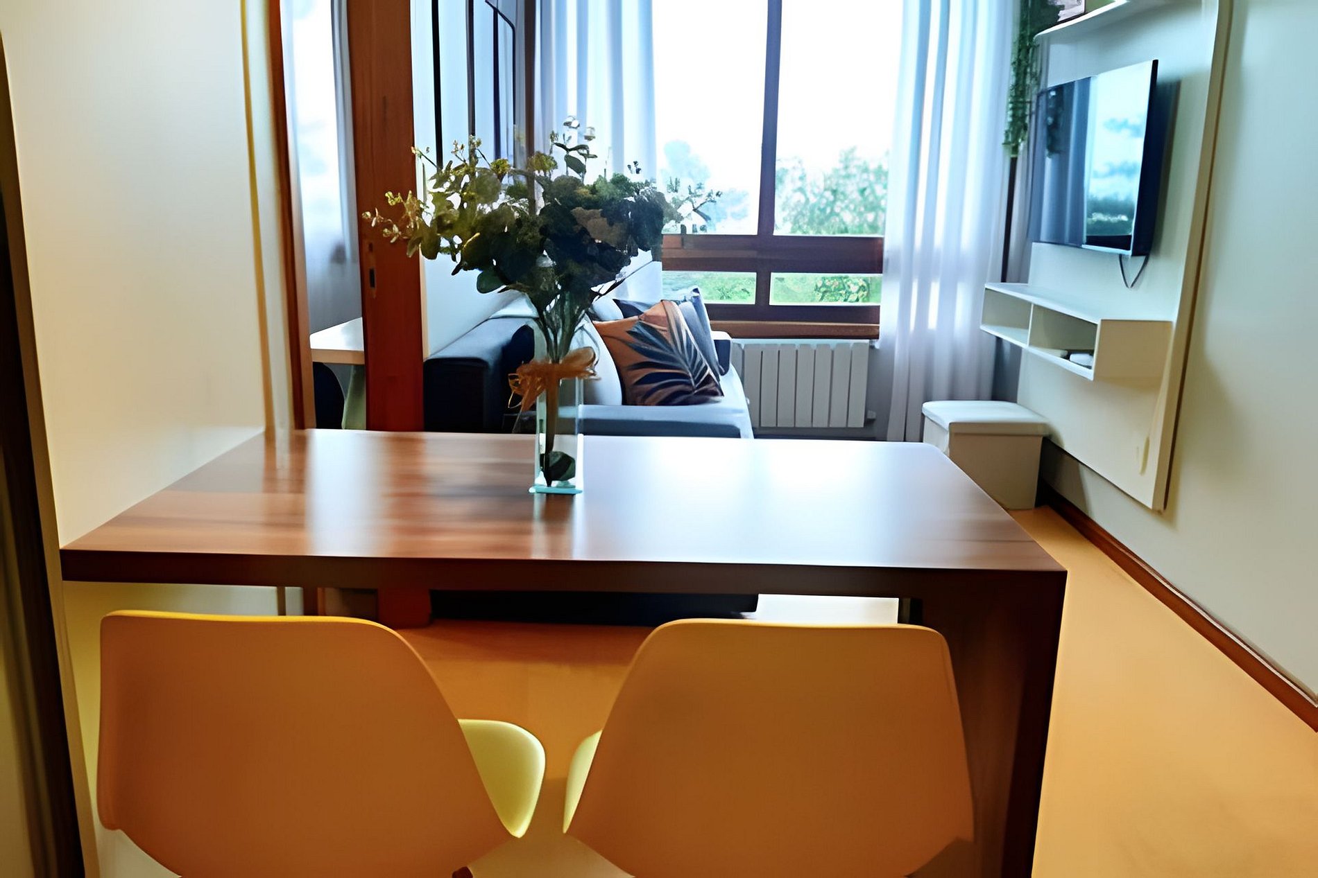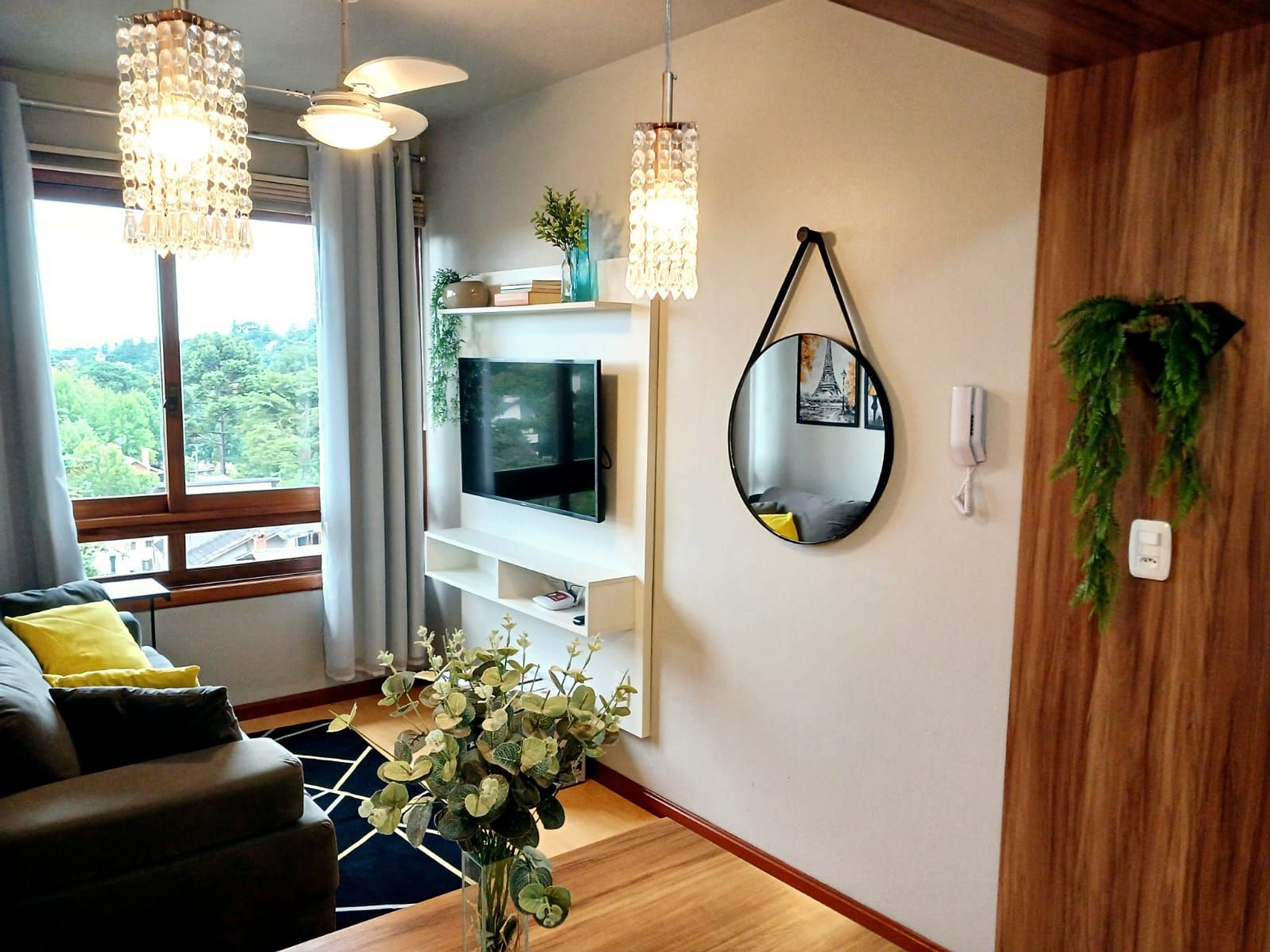 Hemos organizado este flat para recibir a nuestros huéspedes de manera cómoda y funcional. Tenemos una cocina bien equipada, con buenos utensilios. Aire acondicionado en el dormitorio (frío y caliente), calefactor adicional. Estacionamiento privado. Ascensor. Vista hermosa. Ropa de cama, mesa y baño. Juguetes en los pufs, Wi-Fi y TV smart. A pocos metros del centro de Gramado, ¡a 3 cuadras de Borges! Será un placer recibirte.