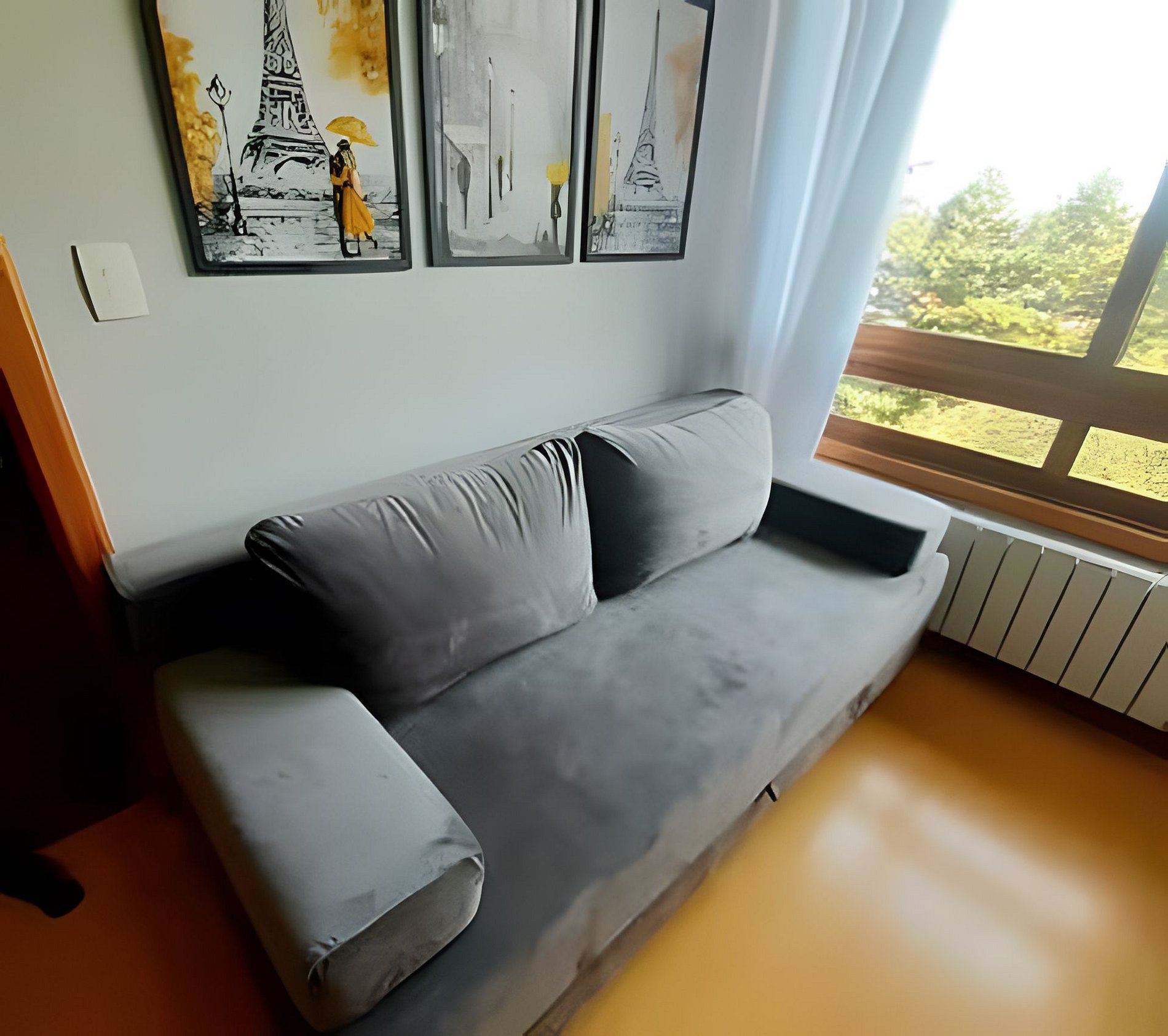 Escogimos con cuidado el sofá cama matrimonial en la sala, extremadamente cómodo y grande.