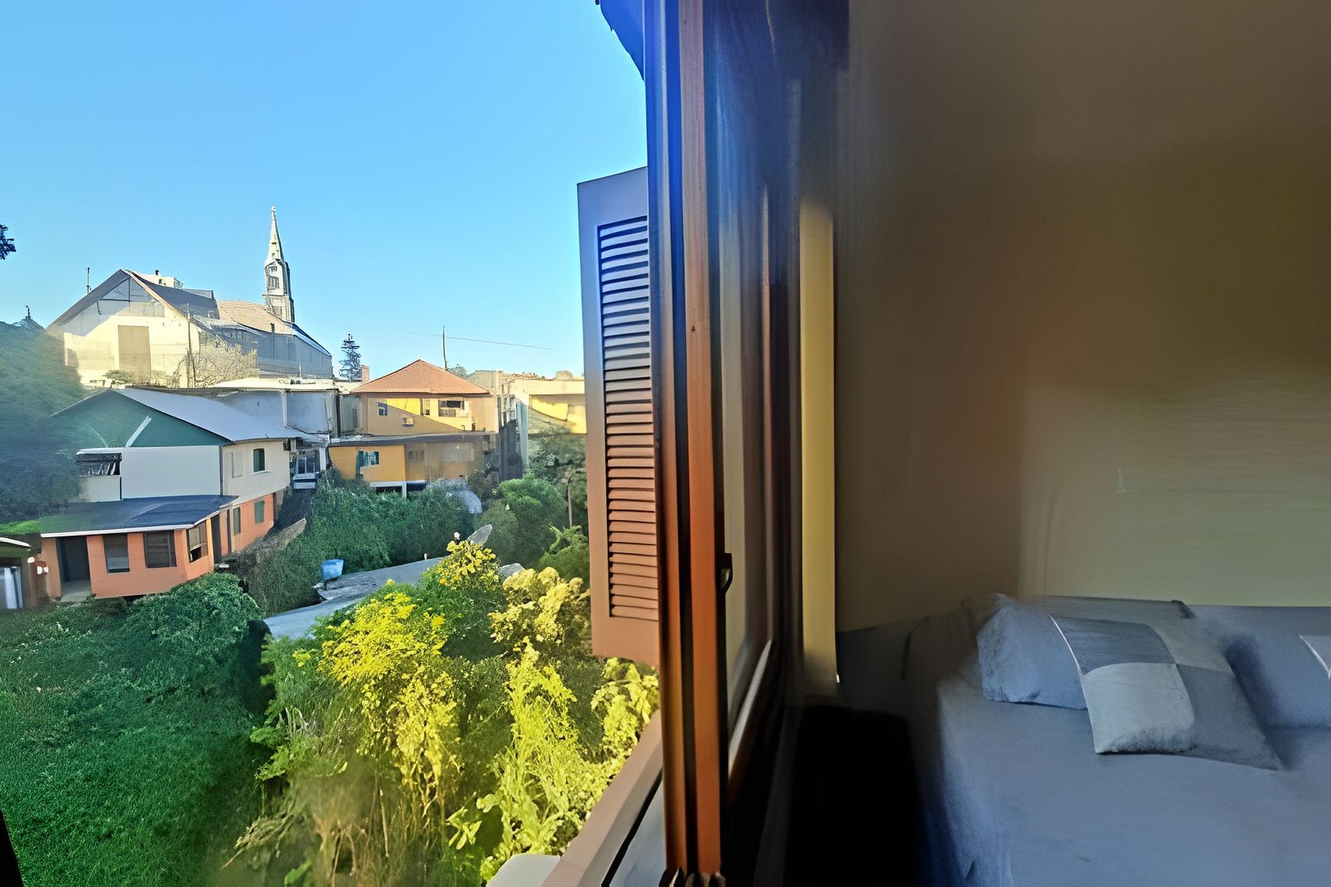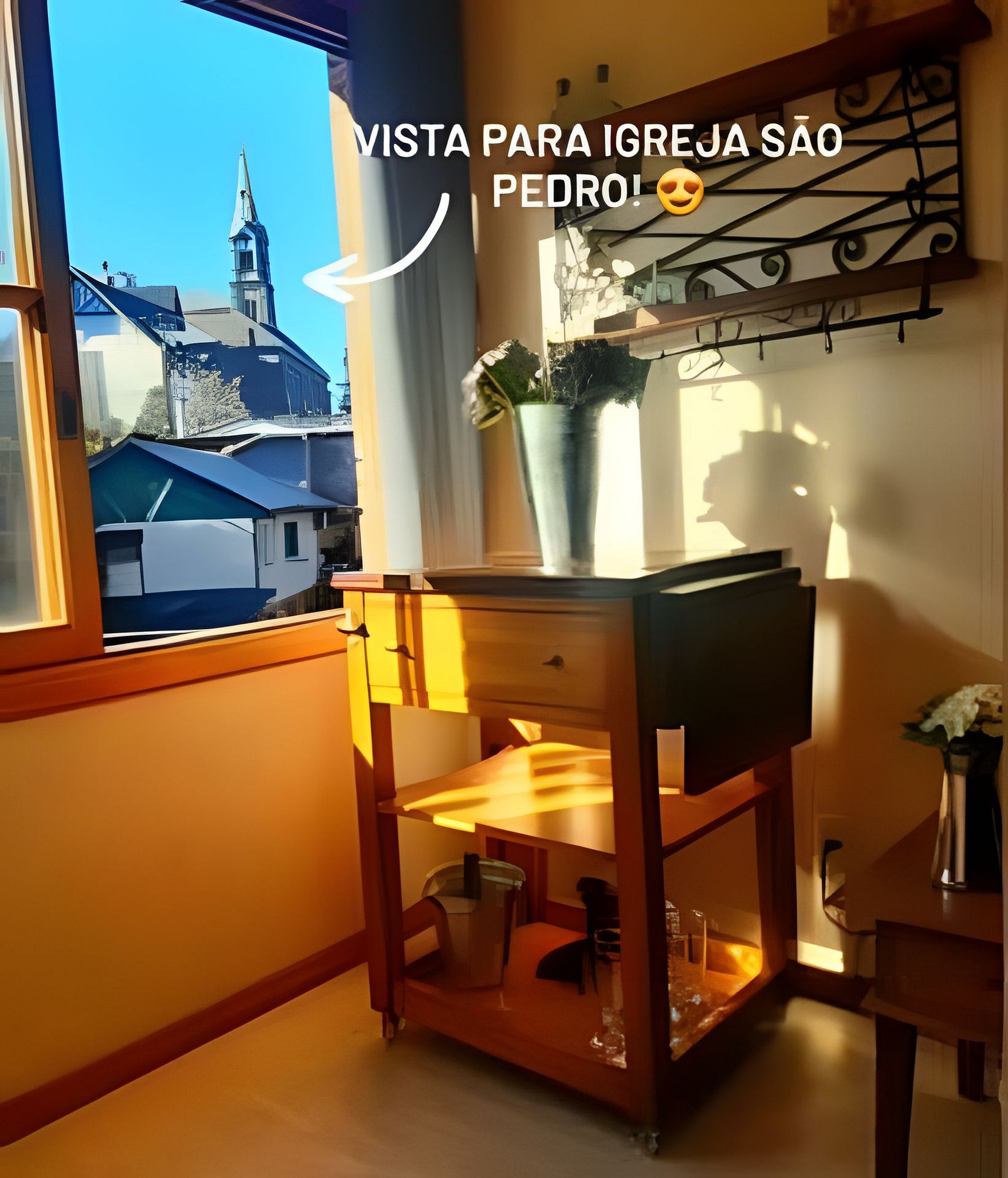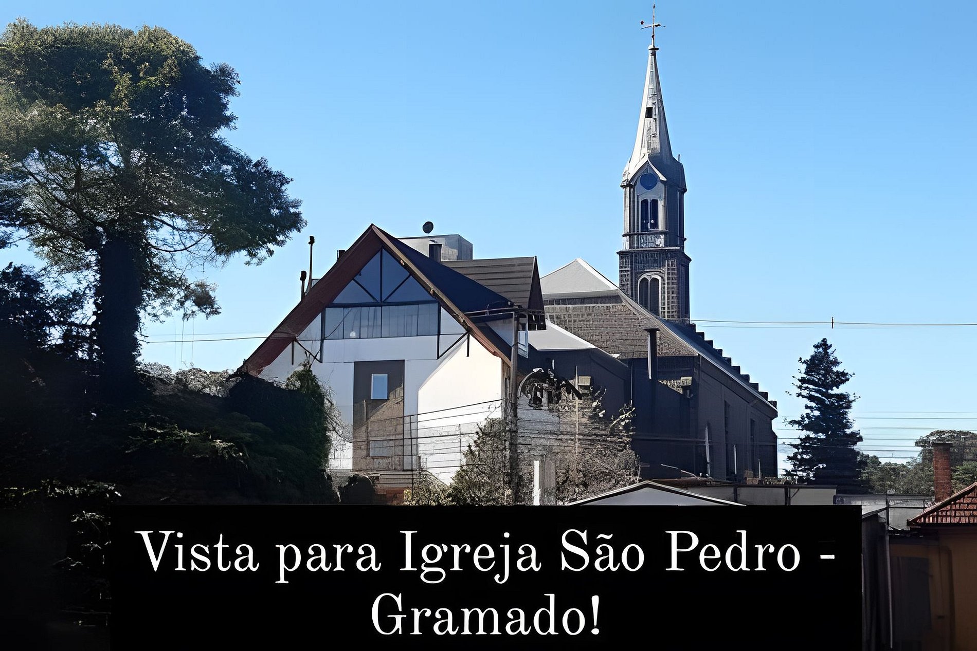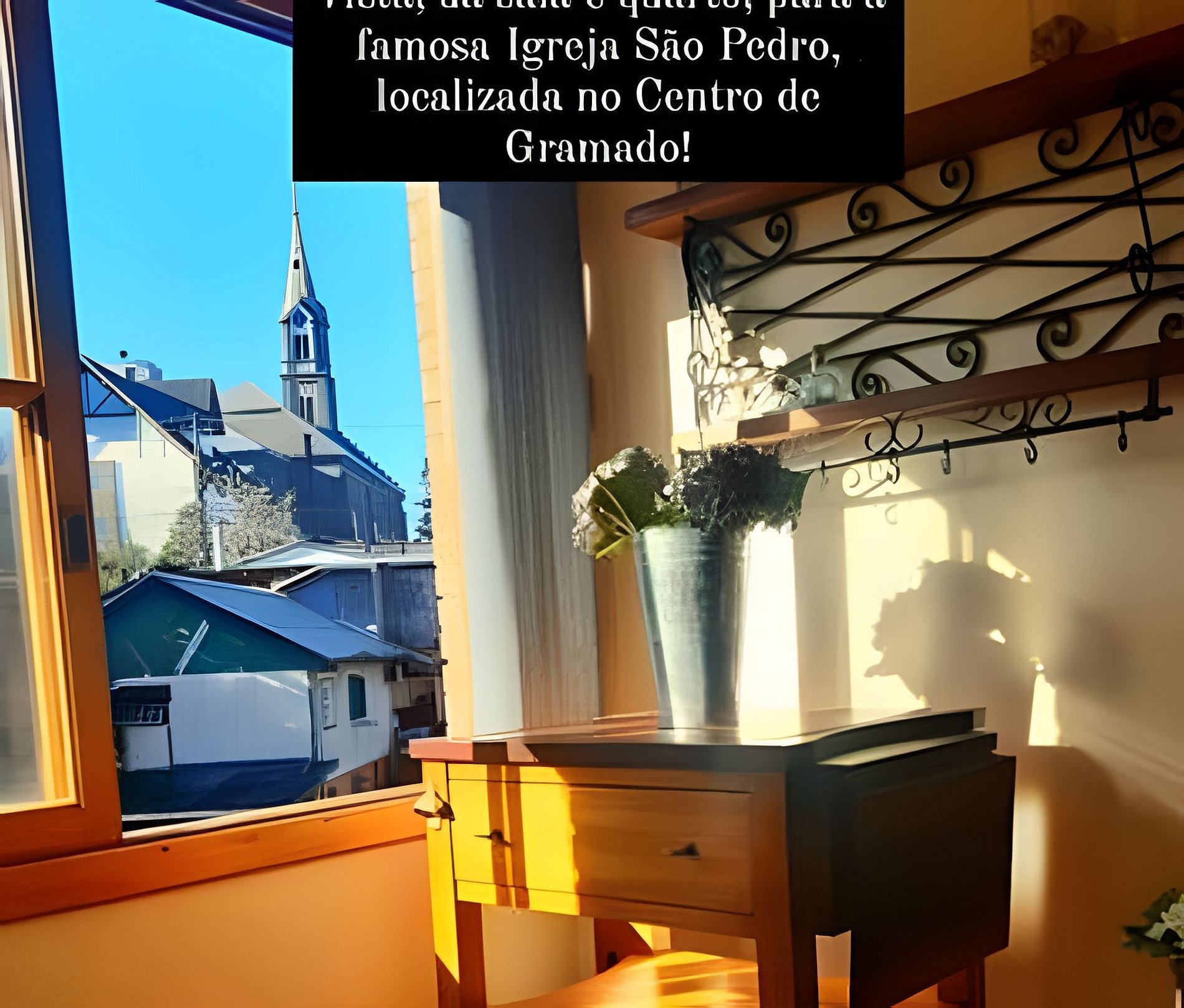 Vista para Igreja São Pedro, lareira, ar condicionado quente e frio no quarto e na sala, garagem privativa coberta.