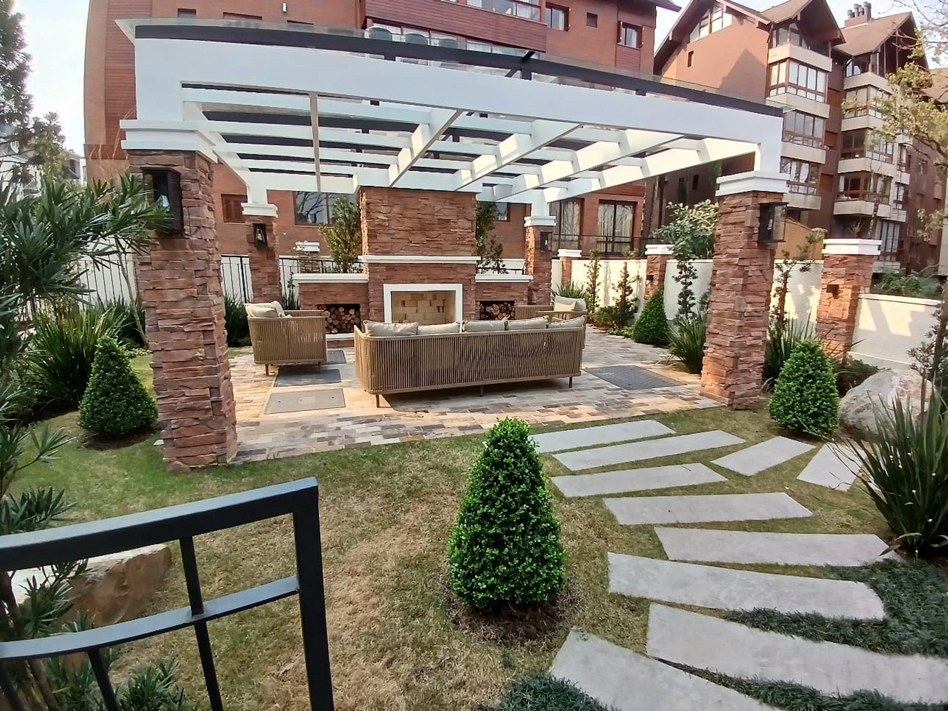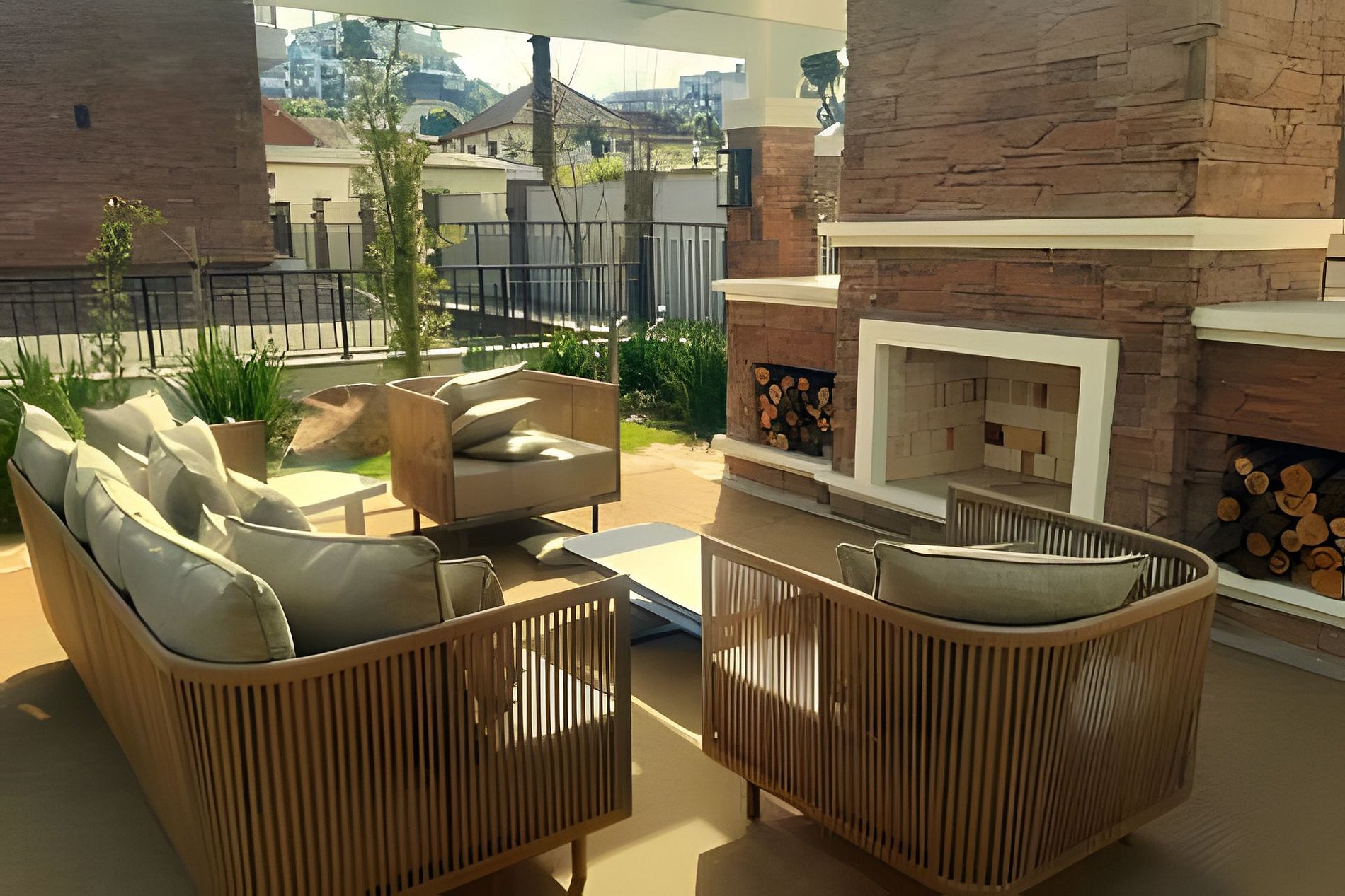 Jardim com Lareira e sofás